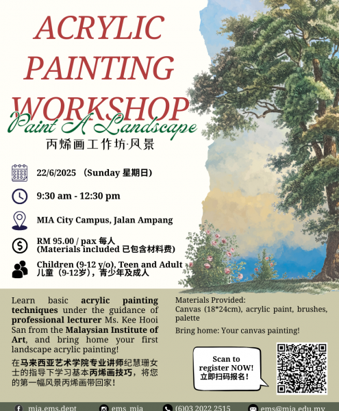 Join us for a vibrant Acrylic Painting Workshop: Paint a Landscape happening on 22th June 2025 (Sunday) 9:30 am – 12:30 pm at MIA City Campus, Jalan Ampang!...