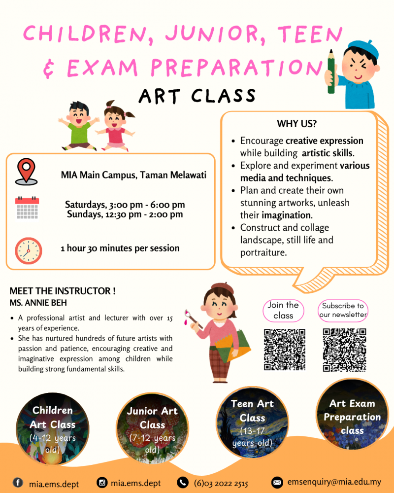 Explore the posters below to discover all available classes. Feel free to drop us a message via inbox for more information or enrol on the spot! You may also contact us at emsenquiry@mia.edu.my or 03-2022 2515.